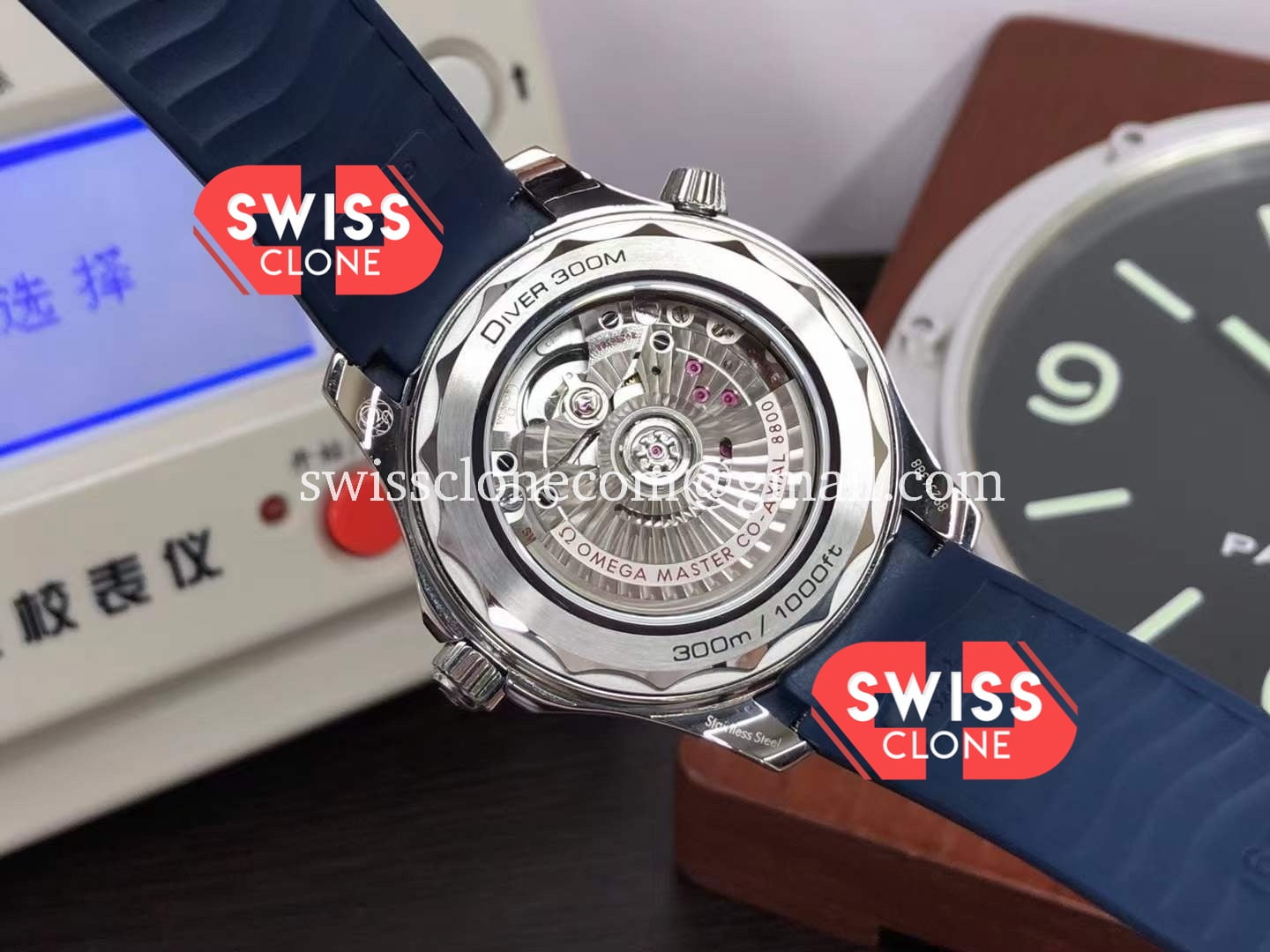 Omega Seamaster 300M Master Chronometer Blue Dial Rubber features premium 904L stainless steel, sapphire crystal glass, and a Swiss automatic movement. Our 1:1 super clone replica is crafted to match every detail of the original Omega timepiece.