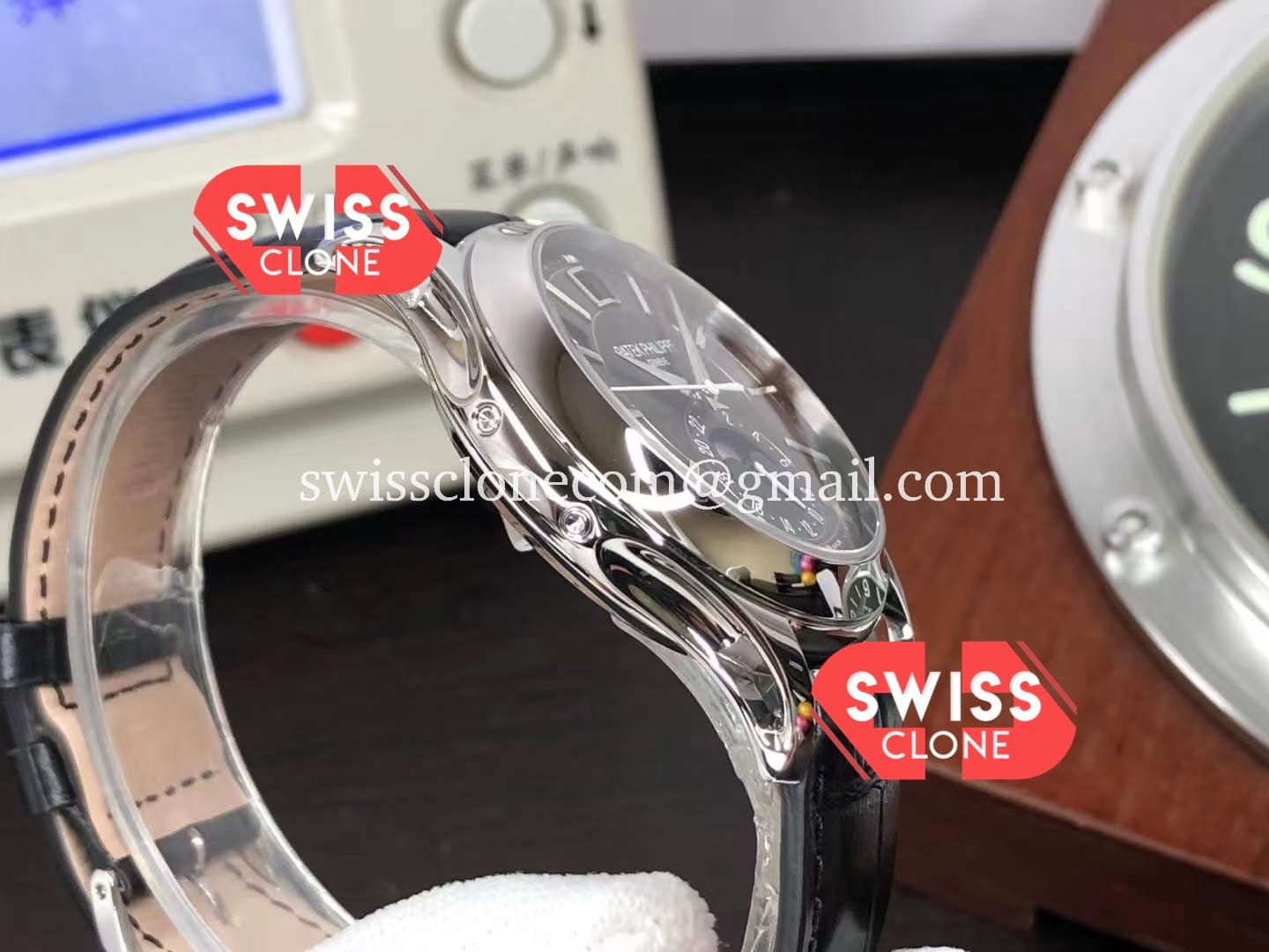 Patek Philippe 5205-001 Complications MoonPhase Dark Grey features premium 904L stainless steel, sapphire crystal glass, and a Swiss automatic movement. Our 1:1 super clone replica is crafted to match every detail of the original Patek Philippe timepiece.