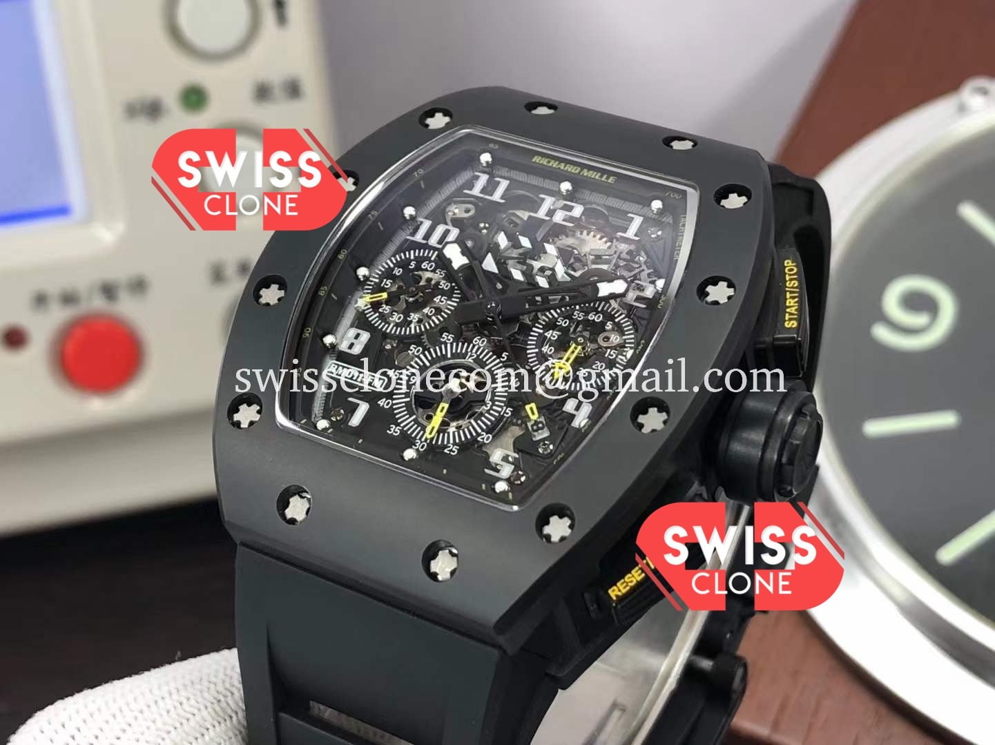 Richard Mille RM011 Felipe Massa Mirror Black Ceramic Case features premium 904L stainless steel, sapphire crystal glass, and a Swiss automatic movement. Our 1:1 super clone replica is crafted to match every detail of the original Richard Mille timepiece.